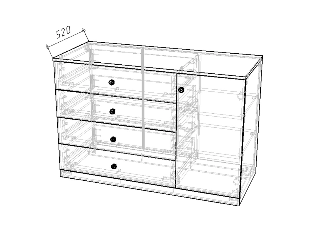 Комплектация: шариковые направляющие 100% выдвижения без доводчика, петли без доводчиков