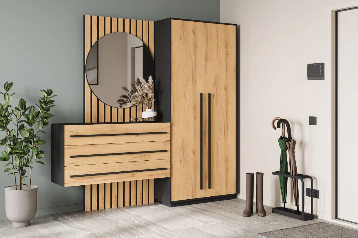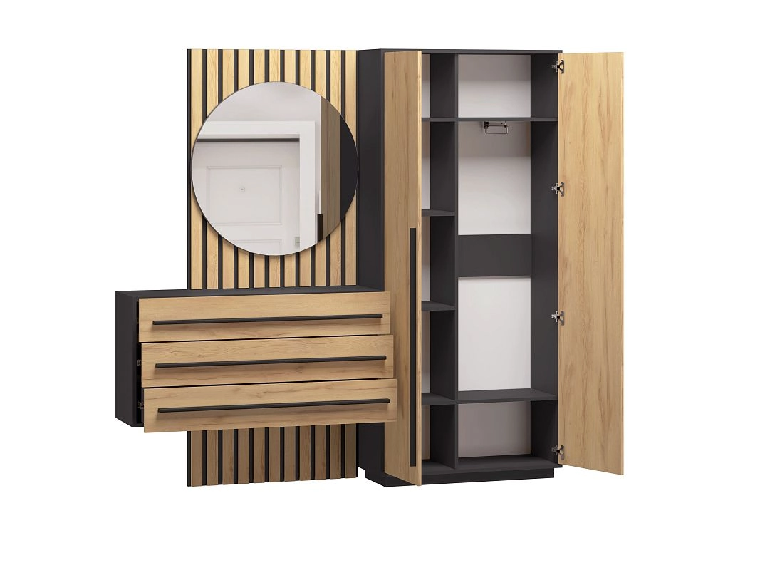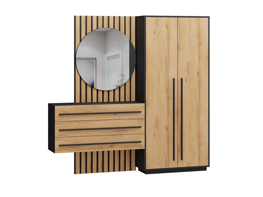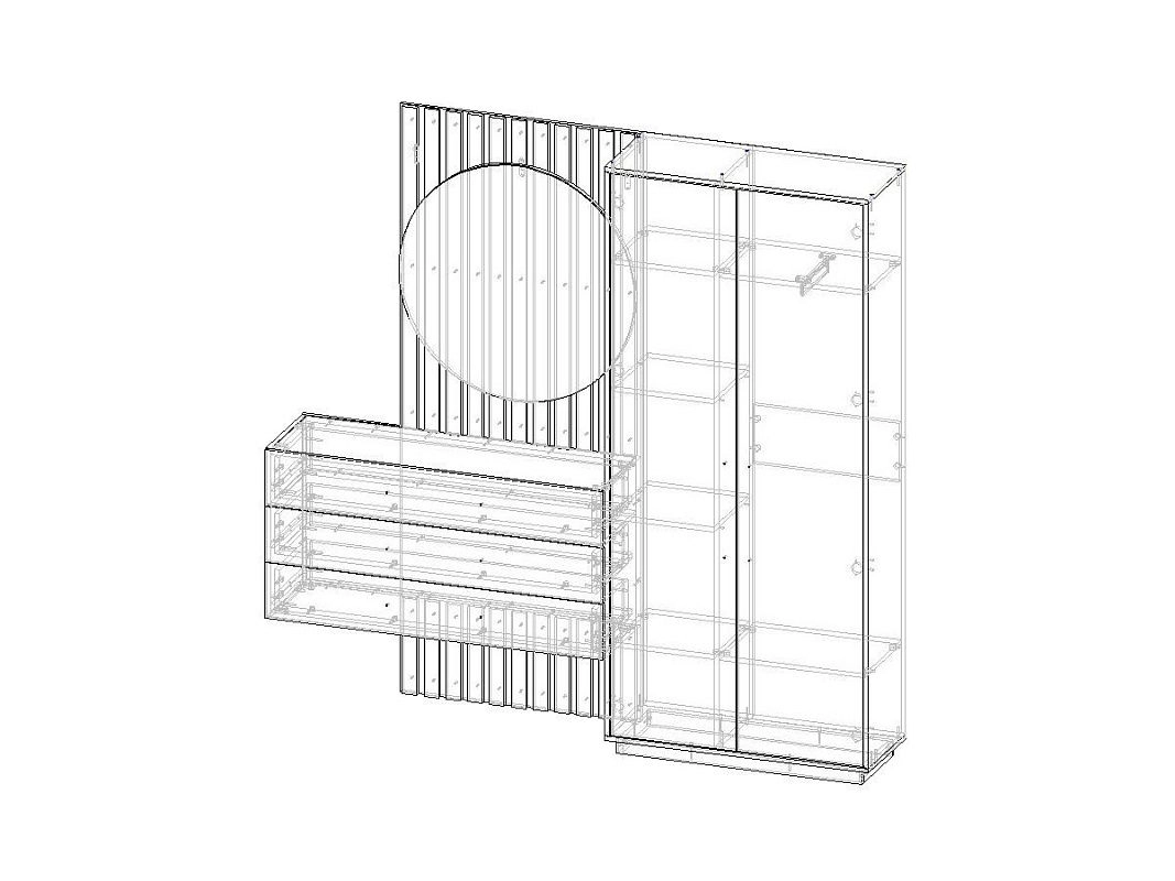 ЛДСП 16мм. Кромка в цвет корпуса. Направляющие на выдвижные ящики 100%. Штанга выдвижная 300мм. Мягкий элемент сидушки. Стекло с пленкой Orakal на столешнице подвесной тумбы. Ручки на шкаф арт.39215, ручки на комод арт. 39212.
