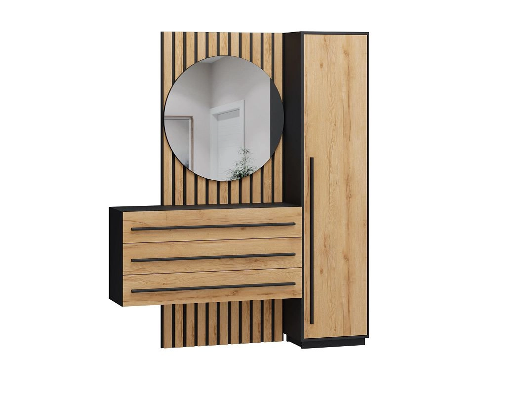 ЛДСП 16мм. Кромка в цвет корпуса. Направляющие на выдвижные ящики 100%. Штанга выдвижная 300мм. Стекло с пленкой Orakal на столешнице тумбы. Ручки на шкаф арт.39215, ручки на комод арт. 39212.