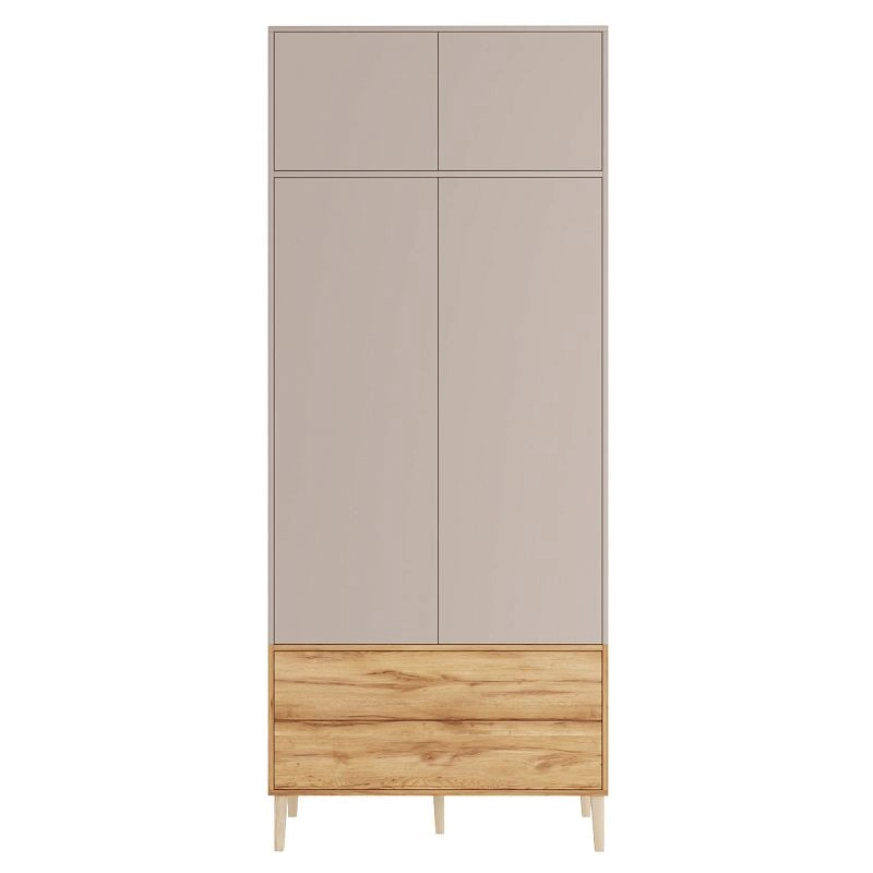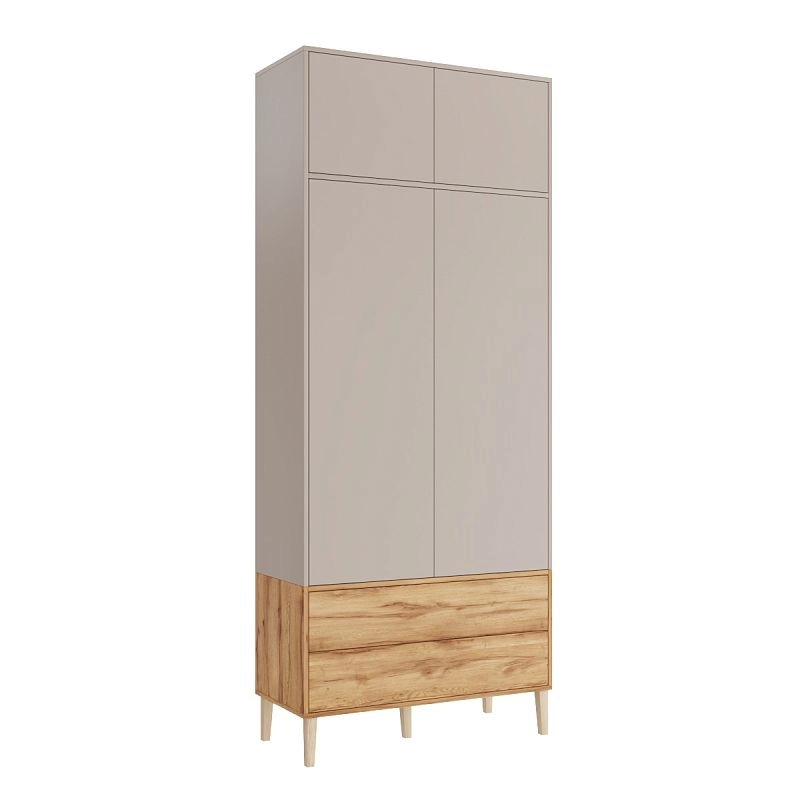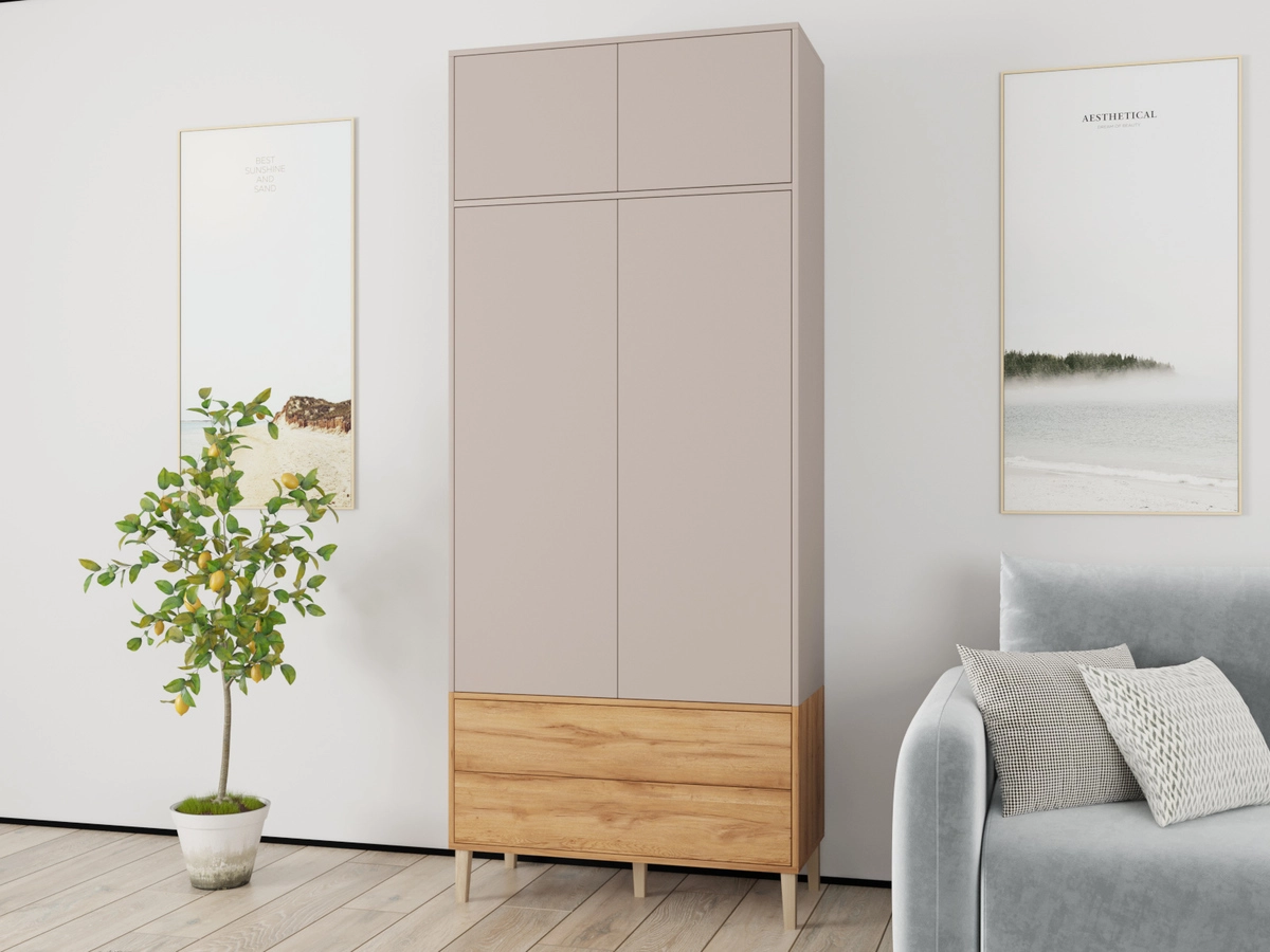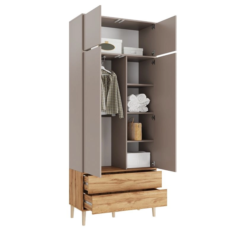 Наполнение: антресольная полка / П (выдвижной кронштейн) / Б (3 полки) / 2 ящика, петли без доводчика, направляющие 100 % выдвижения без доводчика, система открывания Push-to-open, опора массив дерева Н=150мм