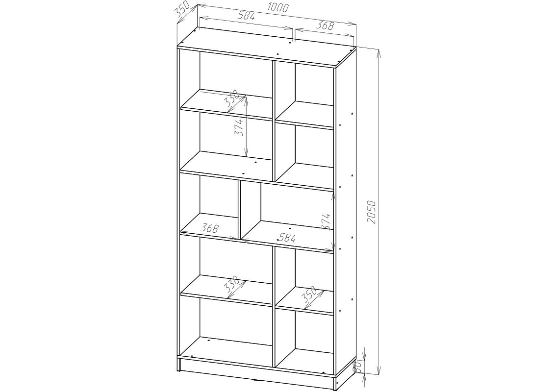 | Книжные шкафы, стеллажи от 600 мм до 1000 мм | 350 | 1000 | 600 |