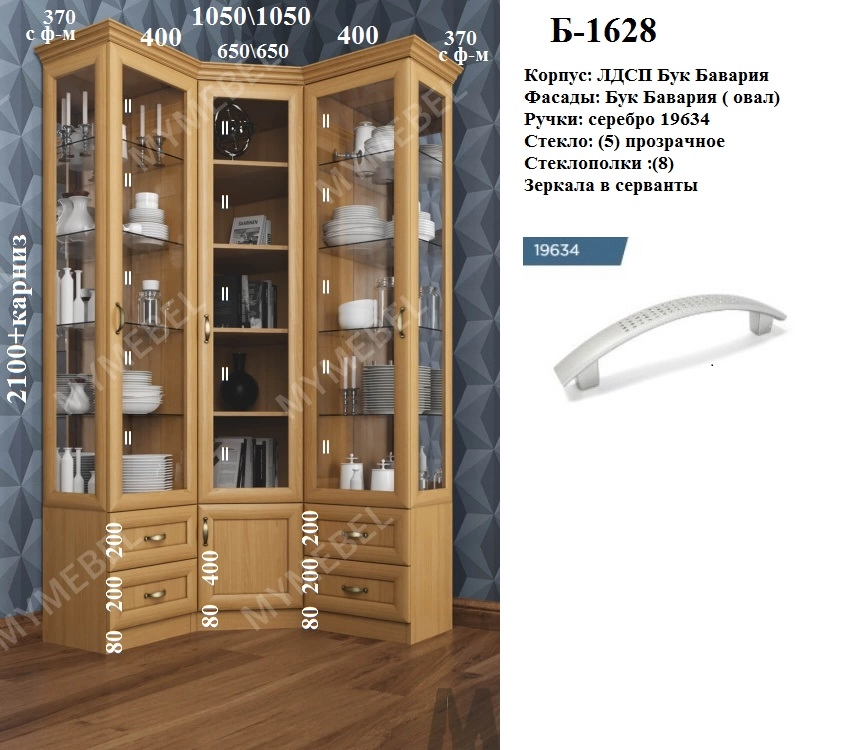 Угловой шкаф 650\650: сверху стеклодверь (внутри 4 полки= 5 ниш, на равном, ручка слева), снизу глухой фасад в400мм+цоколь (внутри ниша), ручка слева\